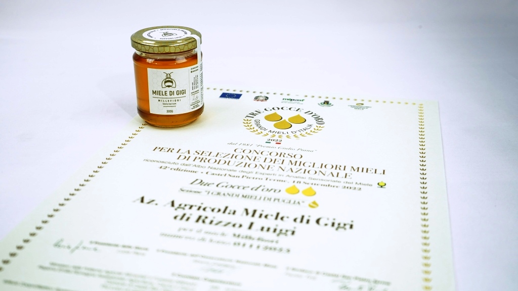 L’azienda di Surano, con i mieli prodotti presso i suoi terreni, ha ottenuto sia il riconoscimento “Due Gocce d’Oro”, con il notevole punteggio di 85,1 punti, e sia due premi “Una Goccia d’oro” per la sezione “I Grandi Mieli di Puglia”, migliorando il risultato del 2021, quando vinse le “Due Gocce d’oro”, con il primo lotto di miele millefiori locale.
