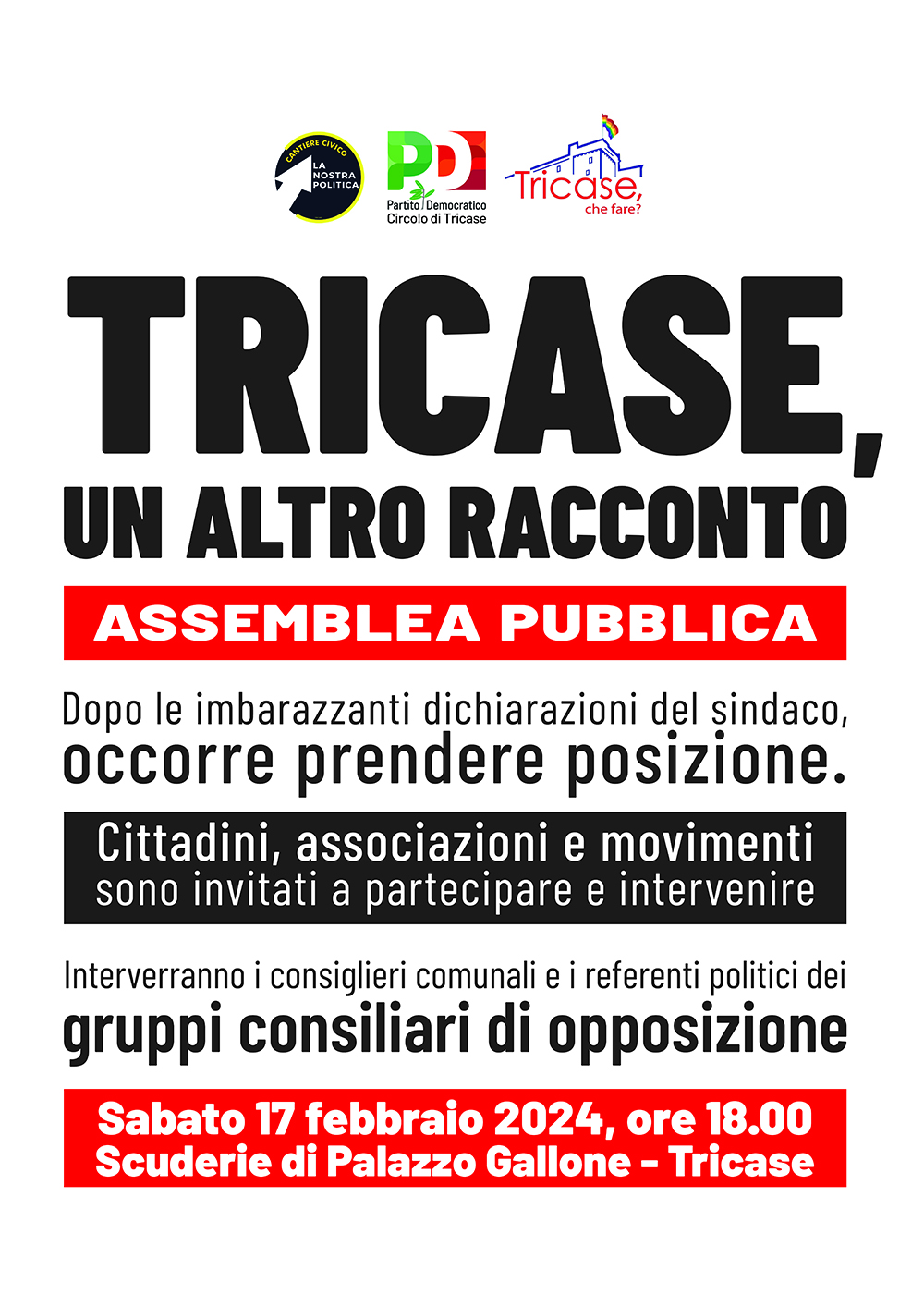 Con una nota i gruppi del Partito Democratico, di Cantiere Civico e di “Tricase, che fare?” informano di aver indetto un’assemblea aperta al pubblico per sabato 17 febbraio, alle ore 18, presso le Scuderie di Palazzo Gallone.