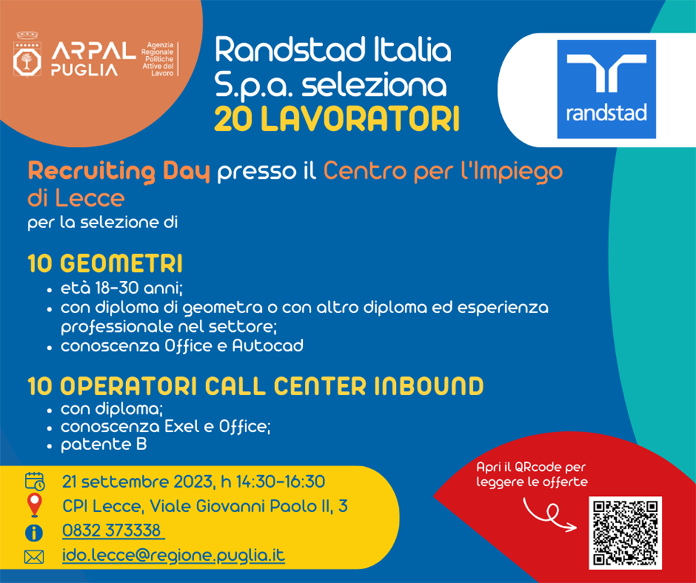 Recruiting Day organizzato da Arpal Puglia e da Randstad S.p.a. presso il Centro per l’Impiego di Lecce.