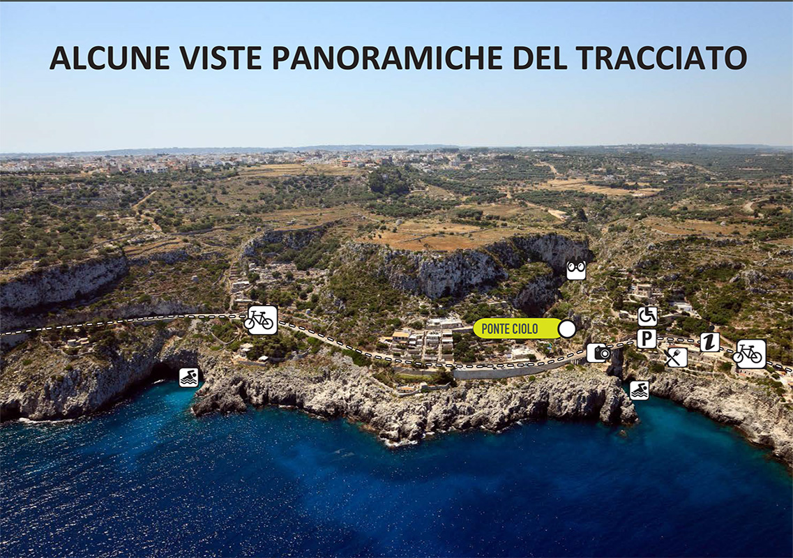 Tra i luoghi raggiungibili attraverso l’itinerario ciclabile ci sono: il Laghetto di bauxite e il Faro della Palacìa ad Otranto, la Grotta dei Cervi di Porto Badisco, a Santa Cesarea Terme, la Grotta della Zinzulusa a Castro, la Baia di Acquaviva di Marittima (Diso), la Marina di Andrano, Tricase Porto, il Canale del Rio, Marina Serra e la sua piscina, Torre Nasparo di Tiggiano, la Guardiola di Corsano, la cala di Marina di Novaglie del Comune di Alessano, il Ciolo a Gagliano del Capo, Santa Maria di Leuca, sulla costa rocciosa tra Punta Ristola e Punta Meliso, con il Santuario di Santa Maria de Finibus Terrae.