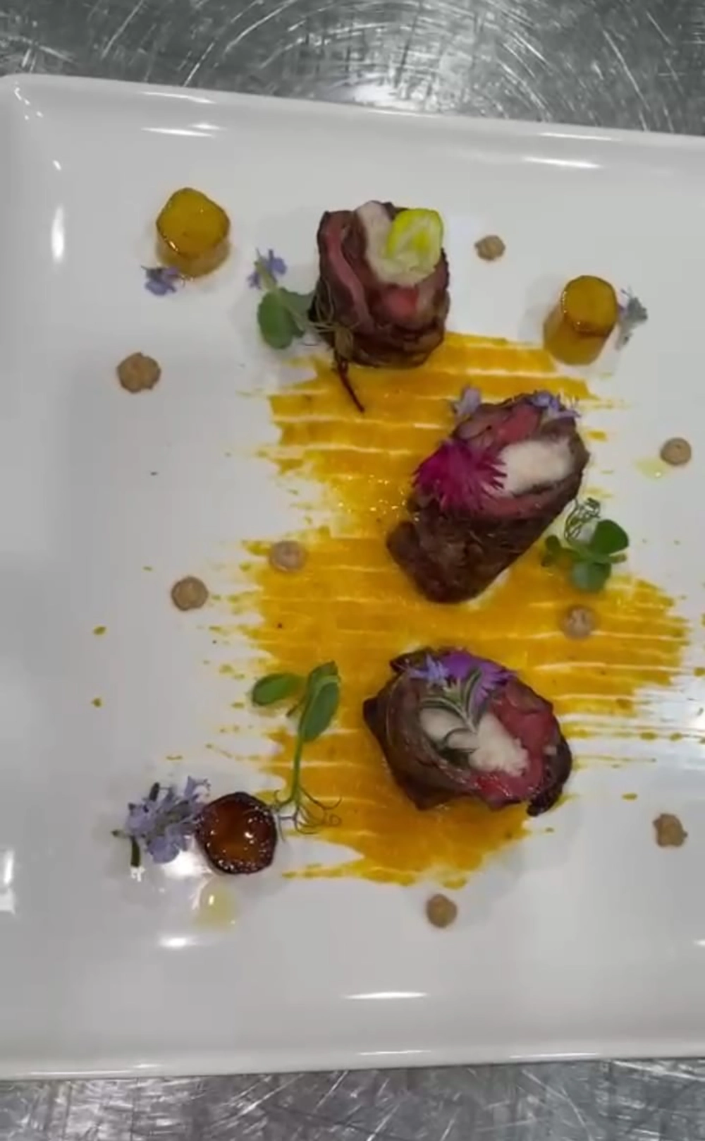 La Lombatina di cefalo in porchetta di maialino nero che è valsa allo chef salentino il Premio 5 Stelle d’Oro della Cucina
