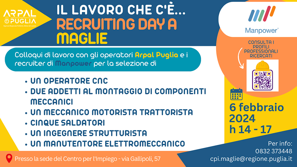 Per info: 0832373448, cpi.maglie@regione.puglia.it.