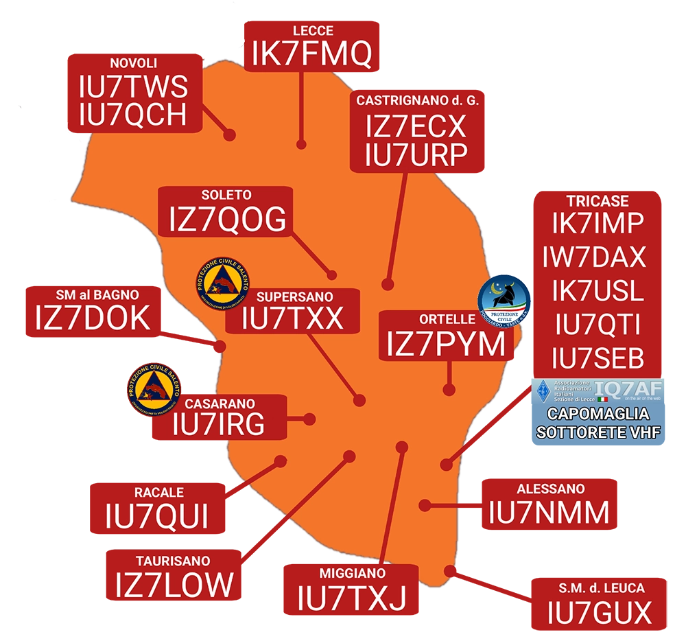 All’esercitazione parteciperanno 15 Radioamatori, sparsi in tutta la provincia di Lecce (anche in rappresentanza di altre associazioni di volontariato), che risponderanno alle chiamate della Stazione Radio Capo-maglia IQ7AF “operata” da Gianluca Eremita IW7DAX, Cosimo Attrotto IK7IMP, Rocco Fersini IU7QTI, Giuseppe Piscopiello IU7SEB con la collaborazione dell’SWL Giuseppe Sergi.