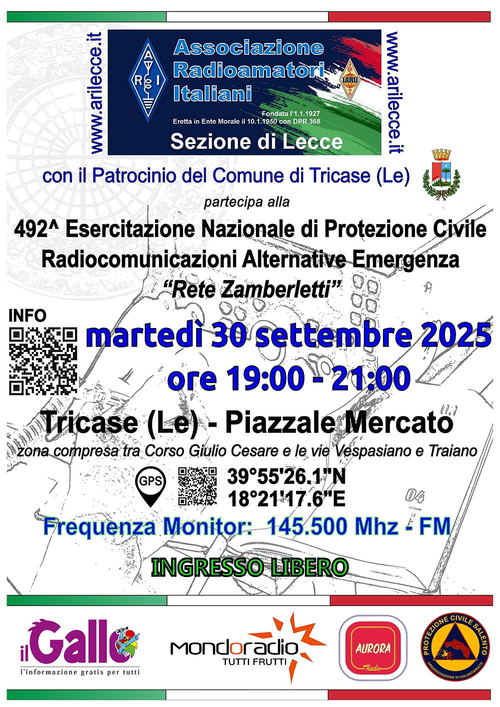 A seguito della convocazione da parte della Prefettura di Lecce, la Sezione di Lecce dell’A.R.I.-Associazione RadioAmatori Italiani prenderà parte alla 492esima Esercitazione Nazionale della “Rete Zamberletti”, la Rete delle Radiocomunicazioni Alternative di Emergenza delle Prefetture.