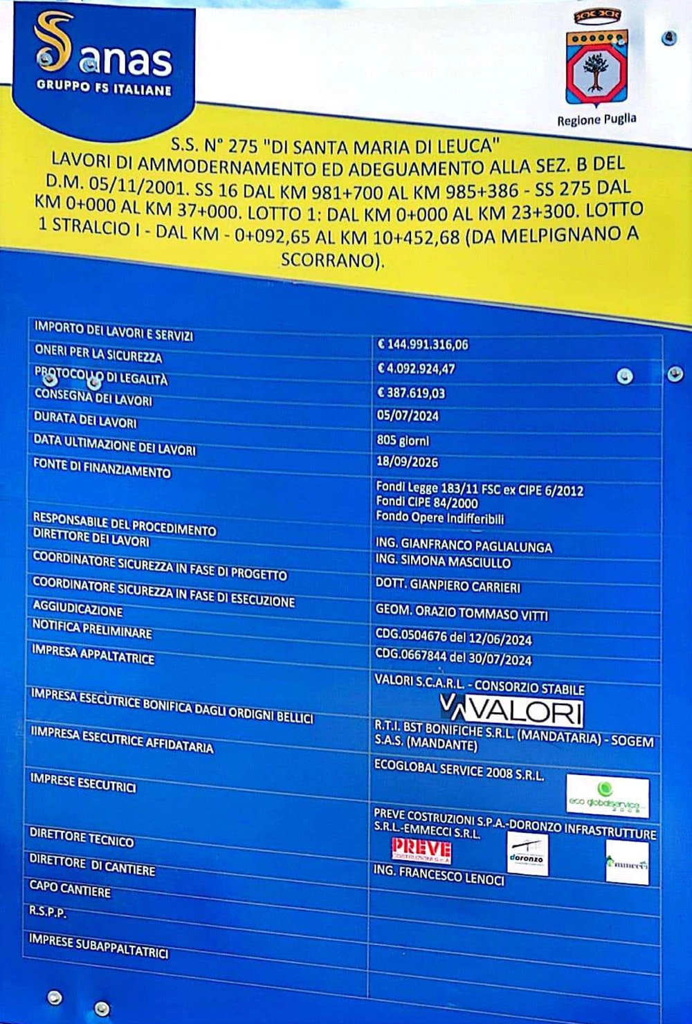 Uno è evidente all’inizio della SS275, proprio dove prima c’era l’autovelox di Melpignano, alla sinistra della carreggiata, per chi scende in direzione Maglie: riporta, come già annunciato a suo tempo da questo sito, anche la data ultima per il completamento dei lavori, vale a dire tra due anni: il 18 settembre 2026.