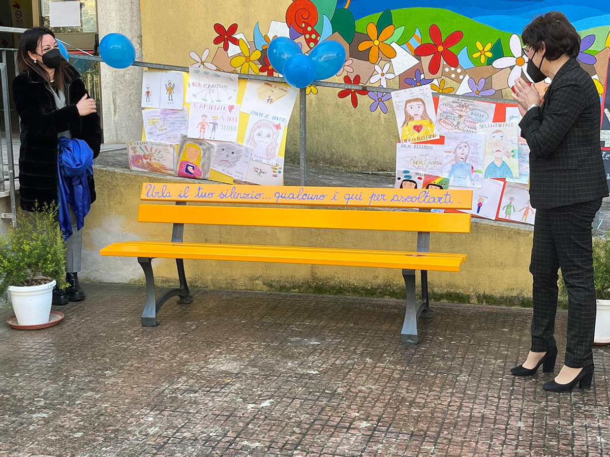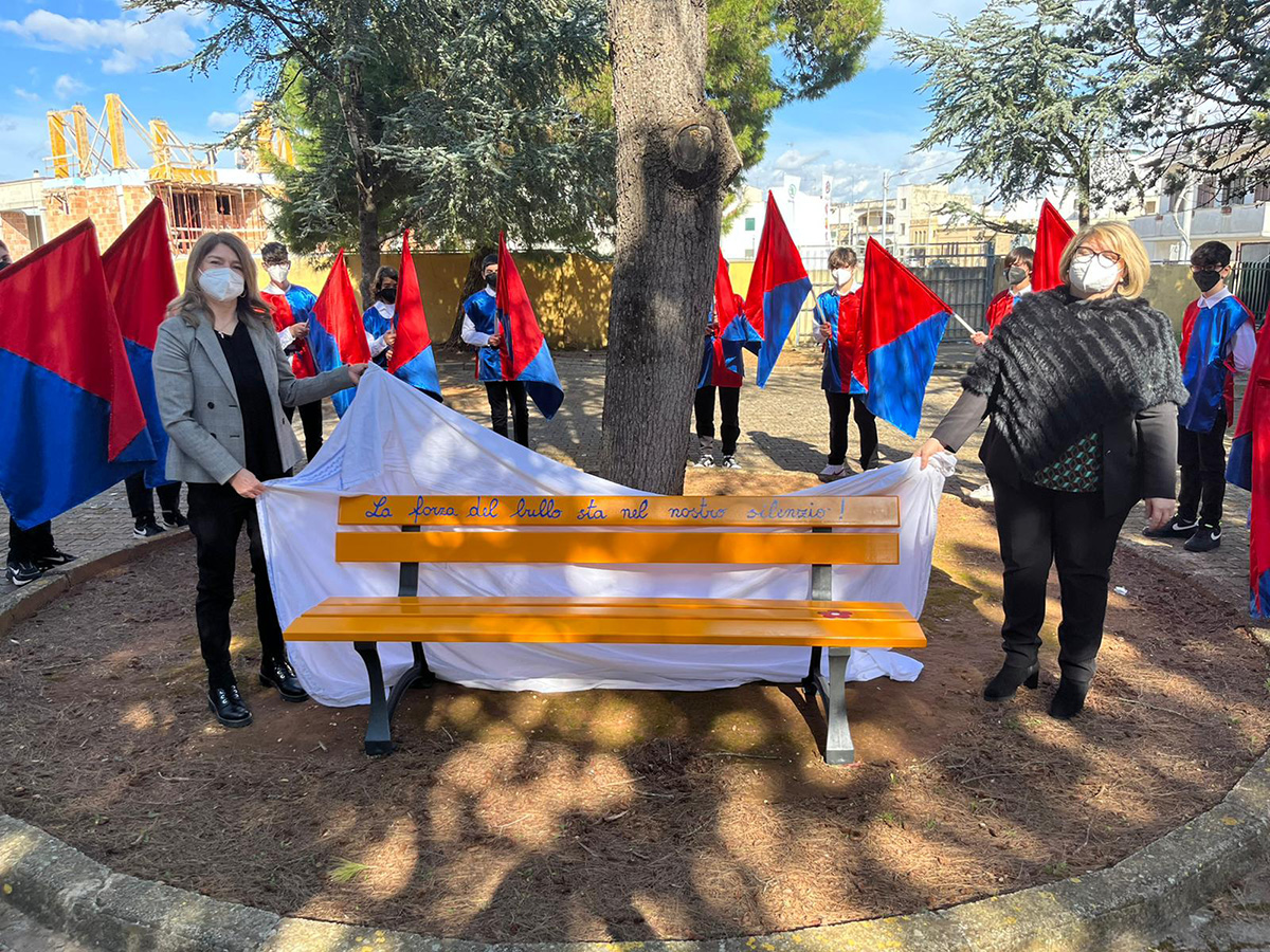 Inziativa dell’associazione culturale “Prometeo” che ha donato una panchina simbolo della lotta al bullismo sia all’I.c. “Pascoli” che al “Via Apulia”. Sulle panchine frasi scelte da ragazzi e ragazze delle rispettive scuole