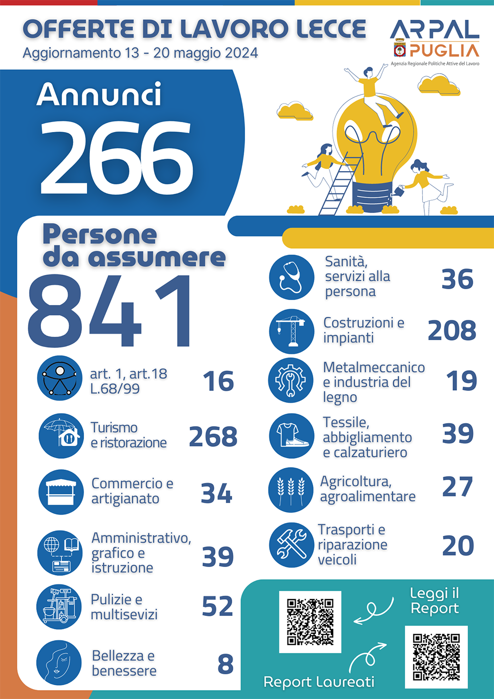Nel 16° Report settimanale delle offerte di lavoro dell’Ambito di Lecce, sono stati registrati un totale di 266 annunci di lavoro che mettono a disposizione un complessivo di 841 posizioni lavorative.