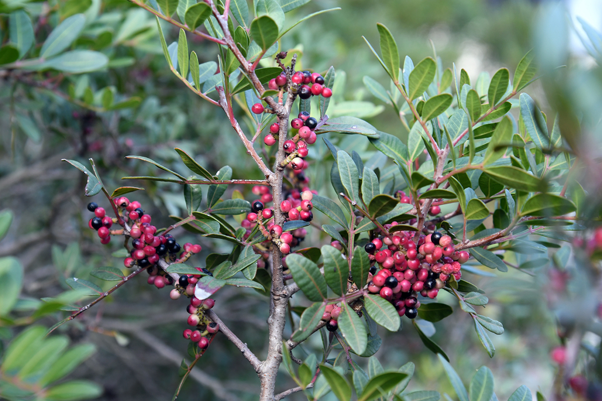 Arbusto tipico della macchia mediterranea, il lentisco (Pistacia lentiscus) appartiene alla famiglia delle Anacardiacee; la pianta dalle cui bacche si ricava l’olio è un arbusto basso e cespuglioso e non un albero.