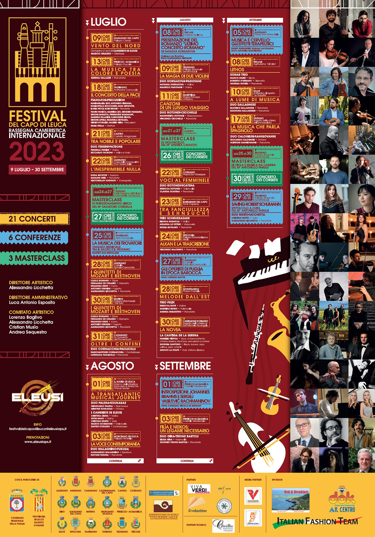 I concerti offrono una varietà di formazioni cameristiche, tra cui il Duo Calogiuri-Sangiovanni, il Duo Malagnino-Fukuda, il Duo Gira-Trione Bartoli, il Duo Palena-Soukaras, il Trio Felix, La Cantiga de la Serena, l’Ensemble Piano-For-Percussion, sino ad arrivare all’Orchestra d’archi dei Cameristi di Eleusi, diretta dal Maestro Marco Grasso, che inaugurerà il Festival il 9 luglio.