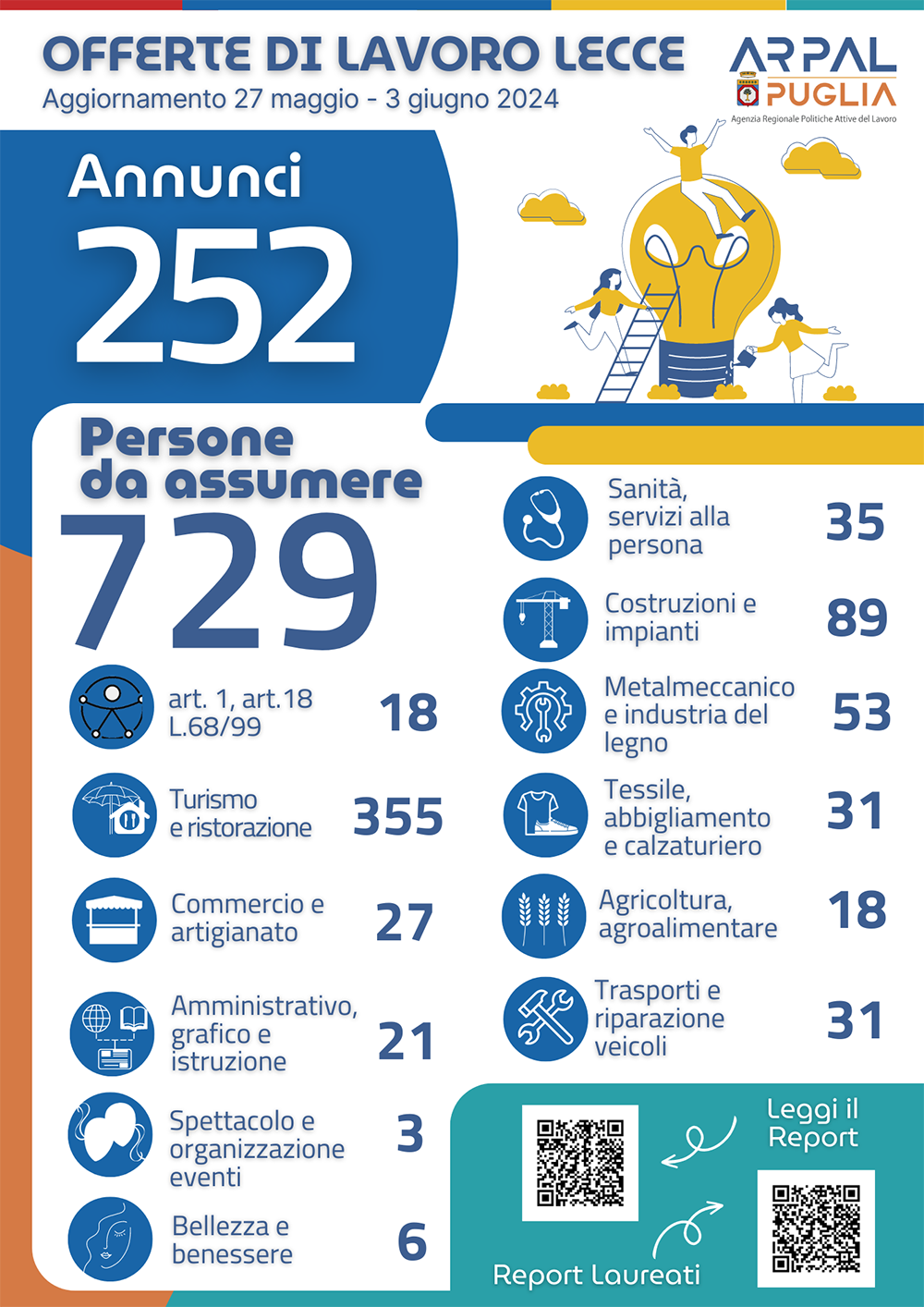 Sono variegate le offerte di lavoro del 18° Report settimanale dell’Ambito di Lecce, che conta 252 annunci per un totale di 729 posizioni lavorative.