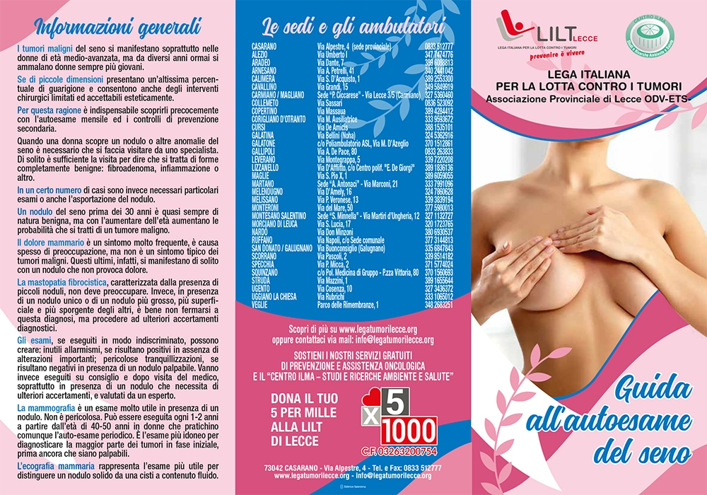 Anche quest’anno, la Lilt di Lecce offre la possibilità alle donne di sottoporsi a visite senologiche gratuite nei 33 Ambulatori Lilt sparsi sul territorio provinciale: per prenotare, basta contattare la delegazione Lilt più vicina (www.legatumorilecce.org) o la sede provinciale Lilt al numero 0833 512777.