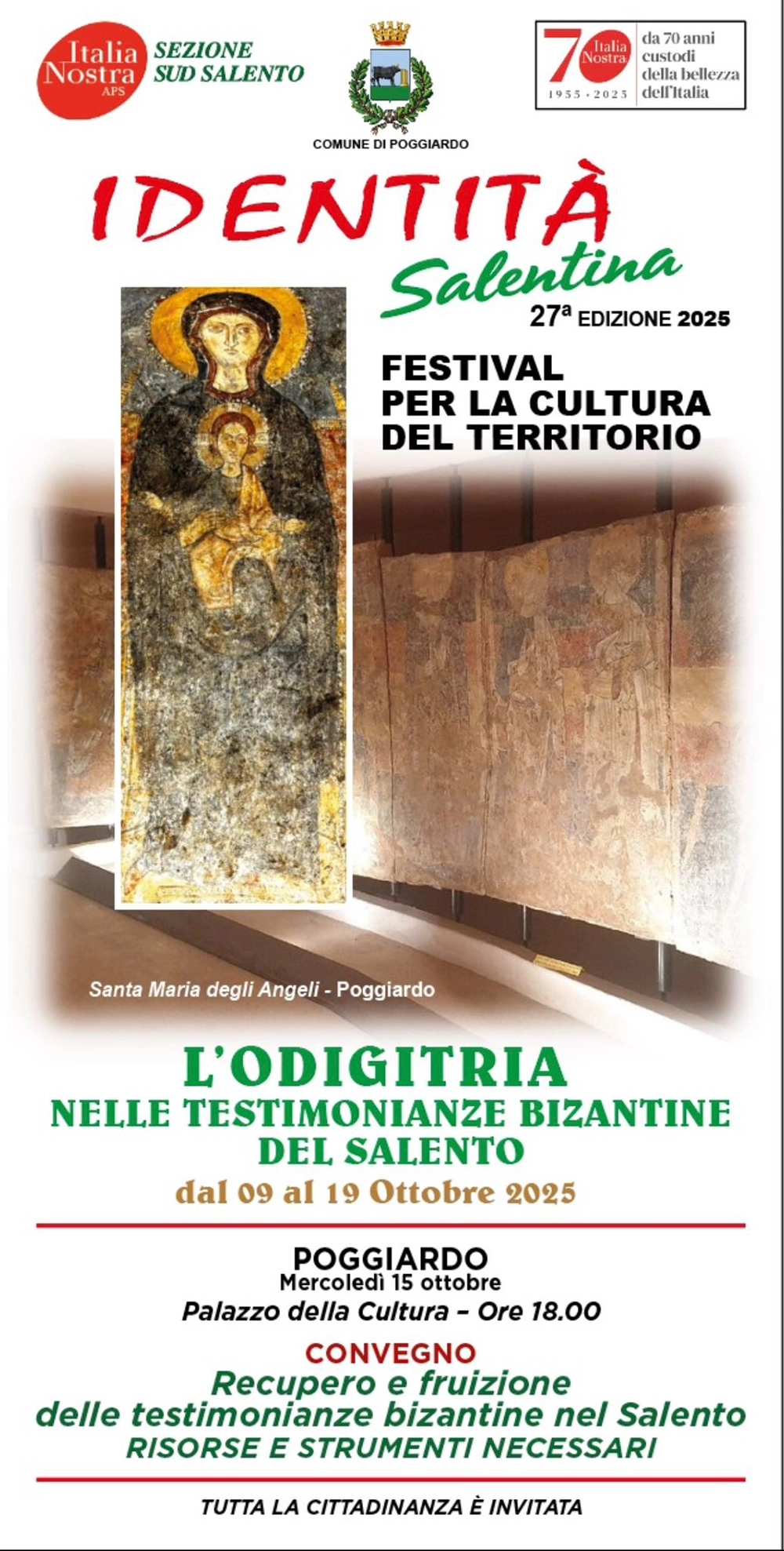 «Ringrazio Italia Nostra – Sezione Sud Salento», ha dichiarato il sindaco di Poggiardo Antonio Ciriolo, «per aver coinvolto il Comune di Poggiardo in questa importante iniziativa culturale dedicata alla figura della Vergine Odigitria, che in Poggiardo trova espressione nell’affresco che dà il nome al Museo degli Affreschi bizantini della Cripta di S. Maria degli Angeli. L’evento è organizzato nel 50° anniversaria della collocazione degli affreschi nell’attuale Museo di Piazza Episcopo, inaugurato da Aldo Moro che potrà essere visitato prima dell’inizio del convegno, a partire dalle ore 17».