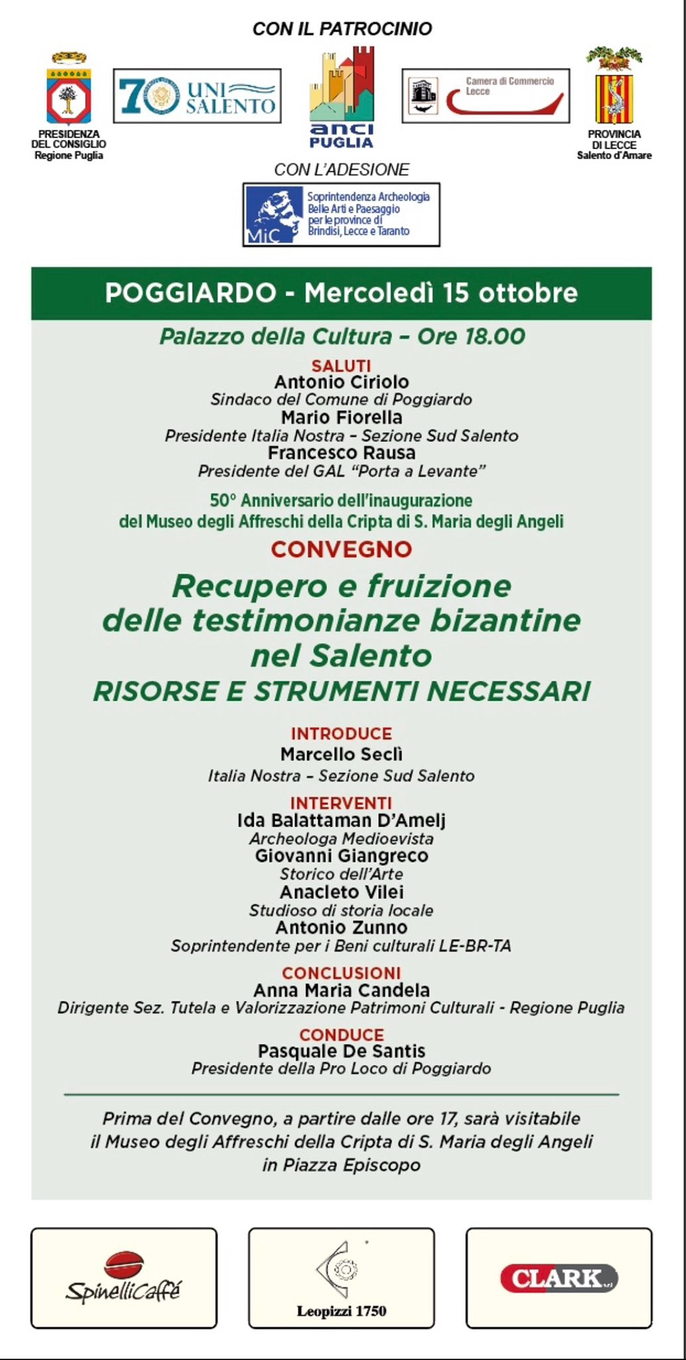 L’evento, organizzato in occasione del 50º anniversario dell’inaugurazione del Museo degli Affreschi bizantini della Cripta di S. Maria degli Angeli, è patrocinato dalla Presidenza del Consiglio della Regione Puglia, dall’Università del Salento, dall’ANCI Puglia, dalla Camera di Commercio di Lecce e dalla Provincia di Lecce, con l’adesione del Ministero della Cultura – Soprintendenza Archeologica, Belle Arti e Paesaggio per le Province di Lecce, Brindisi e Taranto.