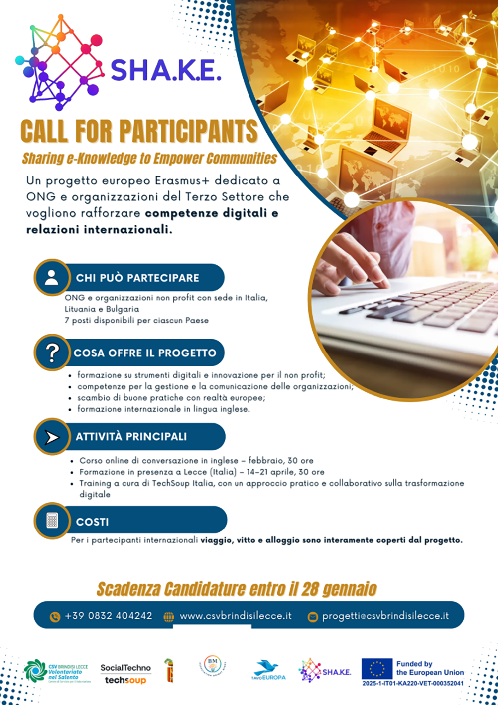 È aperta la Call for Participants del progetto Sha.K.E. – Sharing e-Knowledge to Empower Communities, iniziativa finanziata dal Programma Erasmus+ e rivolta a organizzazioni del Terzo Settore interessate a investire sulle competenze digitali e sull’innovazione organizzativa.