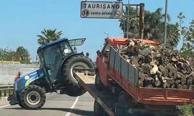 Un camion carico di legna, in equilibrio su in rimorchio, in bilico sotto all’insegna di benvenuto all’ingresso di Taurisano ed un trattore in difficoltà. Sembra un...